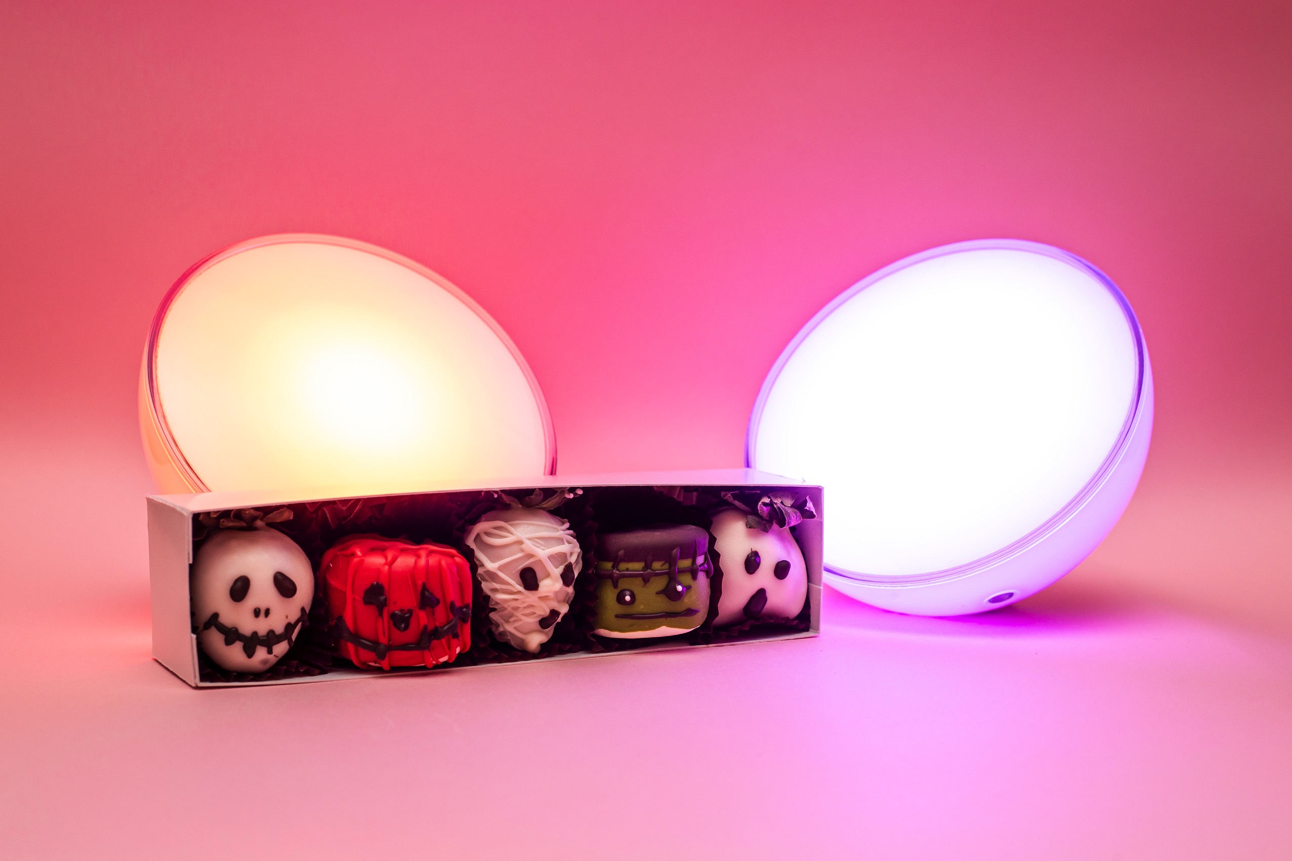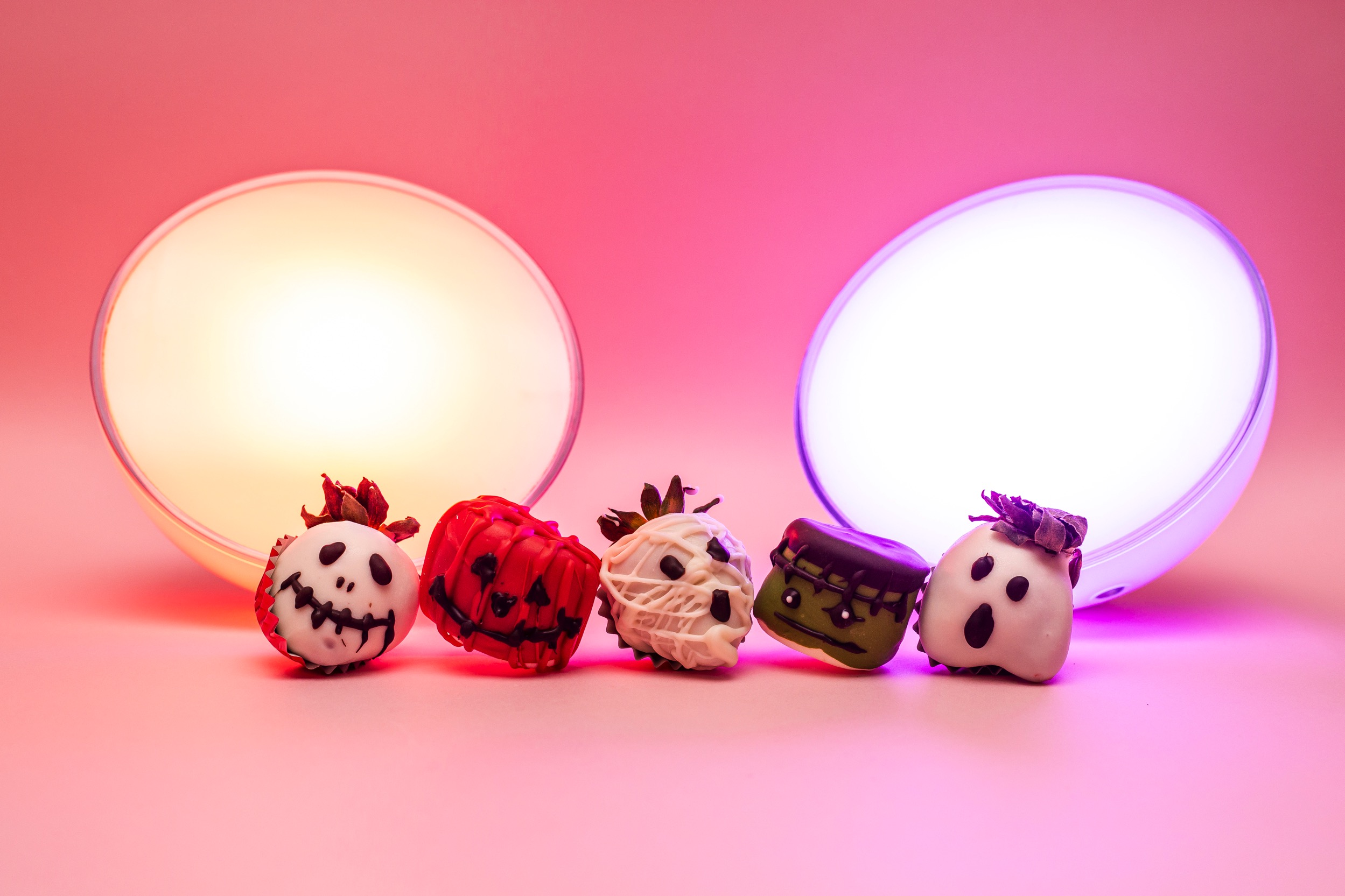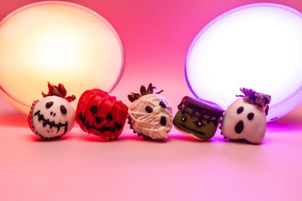 Déjate embrujar con estas fresas y bombones 100% comestibles hechos con una mezcla de chocolate semi amargo y chocolate blanco. ¡Ideales para los niños!